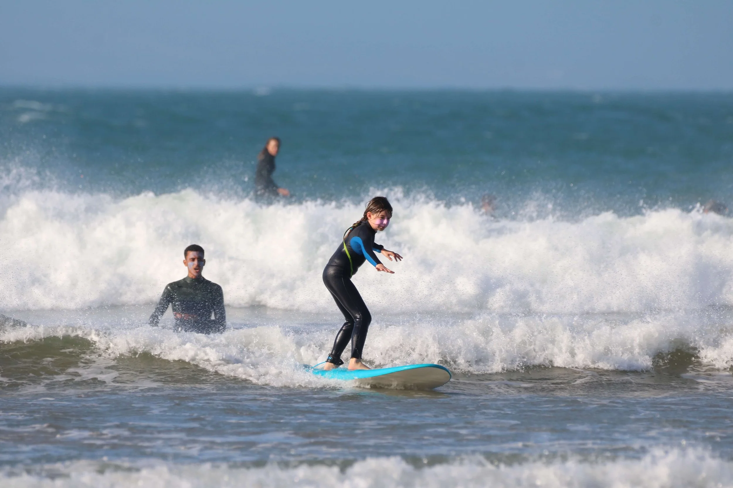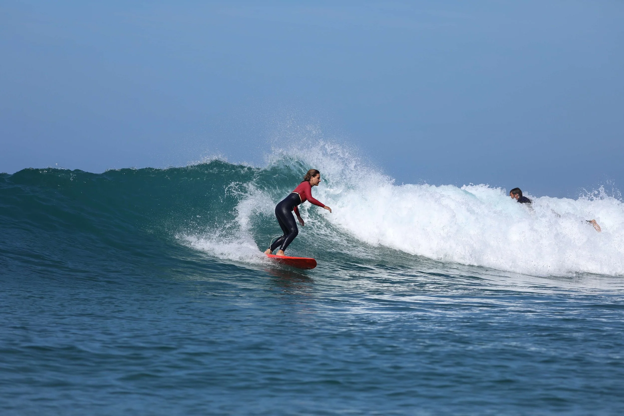 Nous passerons la première séance avec vous dans l’eau, repérant vos forces, votre style, vos faiblesses et le type de vagues avec lesquelles vous devez apprendre/ vous entraîner. Si vous le souhaitez, nous vous donnerons des conseils matériels et d’équipement en fonction de votre niveau et de vos défis. Pour les prochaines séances, nous serons parfois dans l’eau avec vous, d'autres fois à l'extérieur à vous observer, filmer et vous conseiller depuis la côte via un talkie-walkie pour que vous puissiez gagner en indépendance et en confiance.