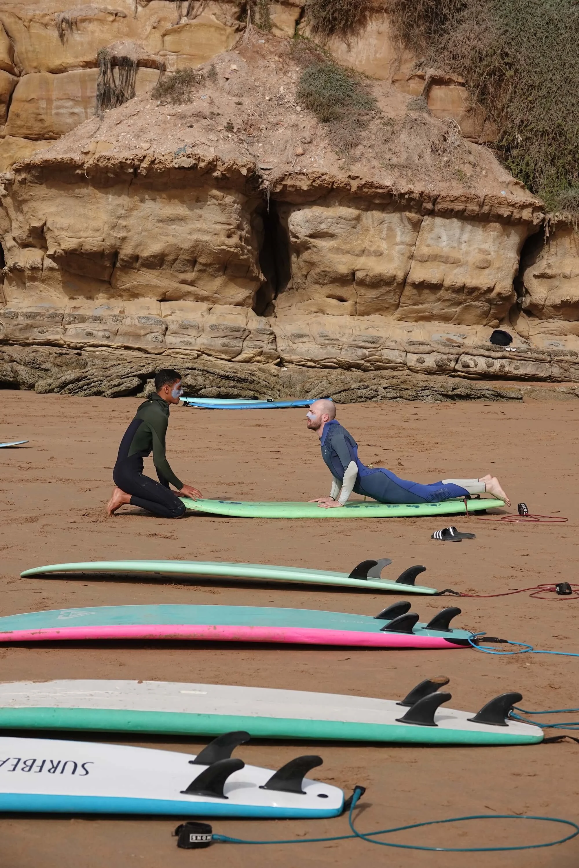 Chaque séance commence par un échauffement corporel essentiel et une explication des vagues + sécurité des pics. Nous prendrons également le temps de comprendre vos attentes et de discuter de vos objectifs de surf. Ensuite, Yallah !